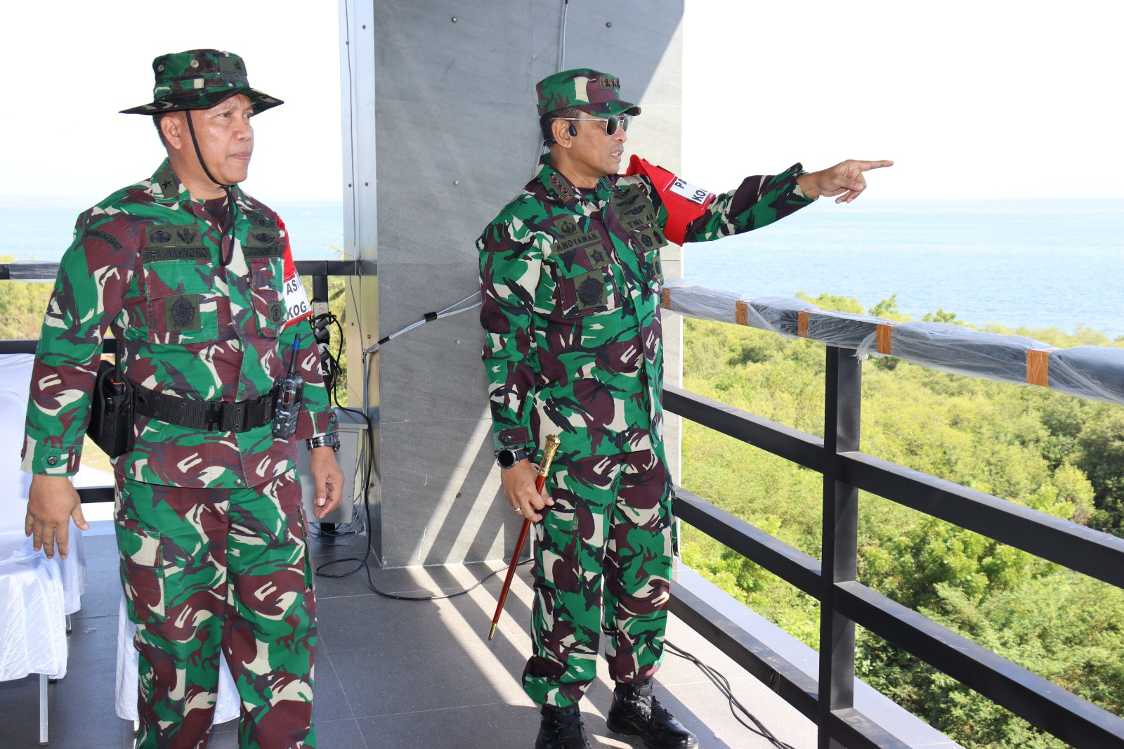 SITUBONDO, JAWA TIMUR (30/07) - Panglima Komando Gabungan Wilayah Pertahanan (Pangkogabwilhan) II selaku Pangkogab TNI II Marsdya TNI Andyawan Martono P., S.I.P., meninjau langsung beberapa Pos-Pos Tinjau yang akan digunakan VVIP atau Pejabat Negara dan TNI untuk menyaksikan langsung Manuver Lapangan (Manlap) pada Latihan Gabungan (Latgab) TNI tahun 2023 di Pos tinjau pendaratan Marinir dan penerjunan Lintas Udara (Linud) pantai Banongan dan Pos tinjau T 12 Pusat Latihan Tempur (Puslatpur) Marinir 5 Baluran, Asembagus, Situbondo, Jawa Timur, Jum'at (28/7/2023).